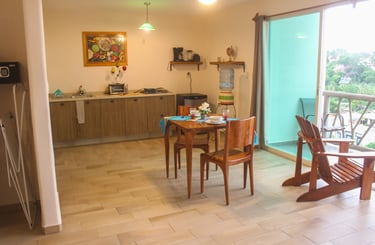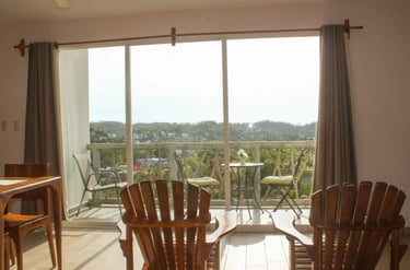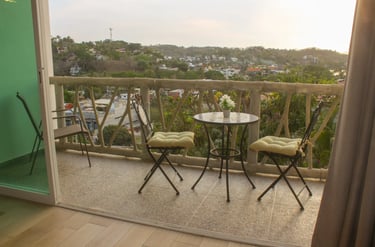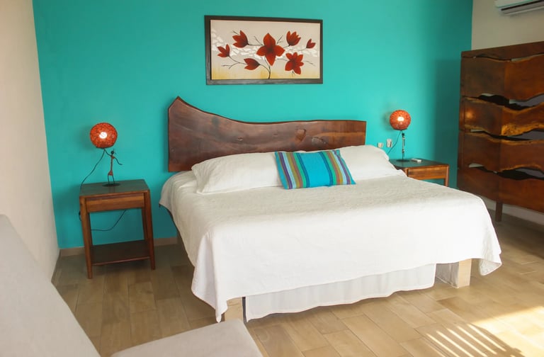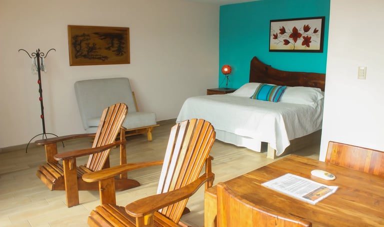 Situado en el tercer piso, el Refugio Guacamaya ofrece una de las mejores vistas panorámicas de Villa Los Corales: paisajes naturales se despliegan frente a ti desde su balcón privado de 7.5 m². Con 45 m² de superficie interior y una espaciosa cama king, este refugio es perfecto para quienes buscan comodidad, amplitud y un ambiente tranquilo con carácter mexicano.