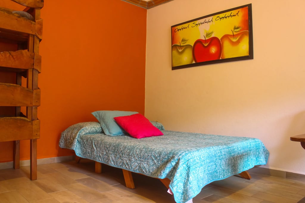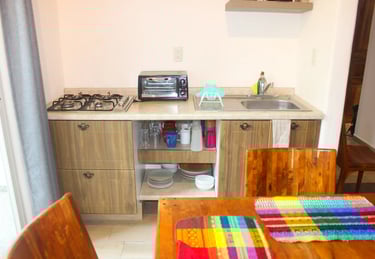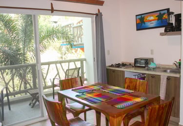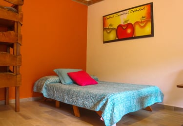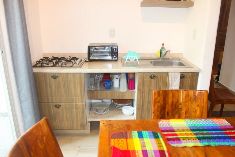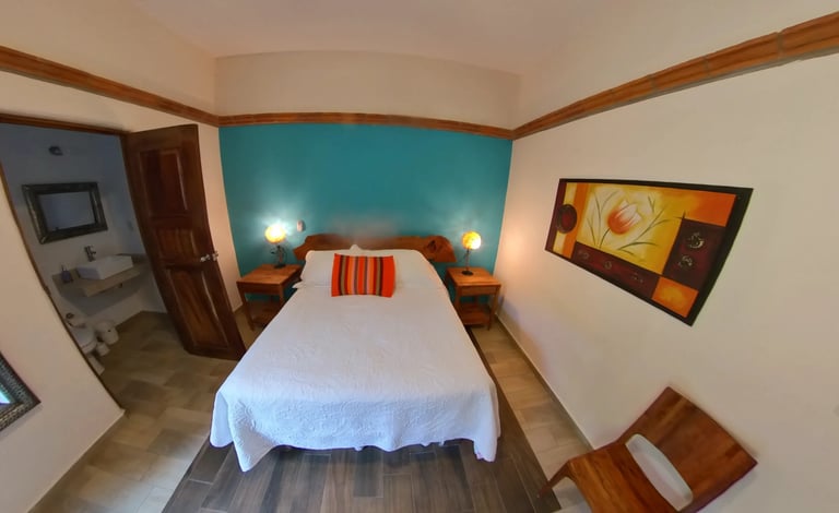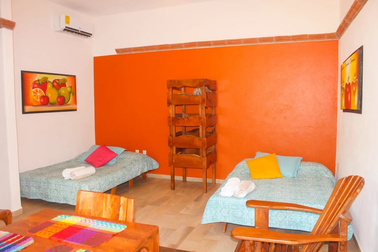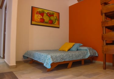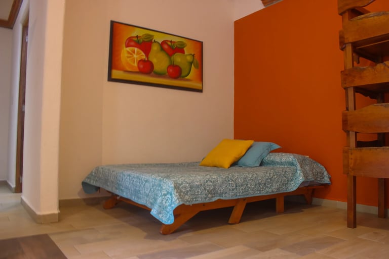 Con 57 m², este amplio refugio en el segundo piso es ideal para parejas, familias o grupos pequeños de hasta 4 personas. Cuenta con una habitación principal con cama queen y baño completo, una sala con dos futones, comedor, cocina equipada para 6 personas y un segundo baño. Su balcón privado recibe la luz del amanecer, y su cercanía a la terraza con alberca lo convierte en una opción versátil y luminosa para disfrutar Sayulita en grupo o en pareja.