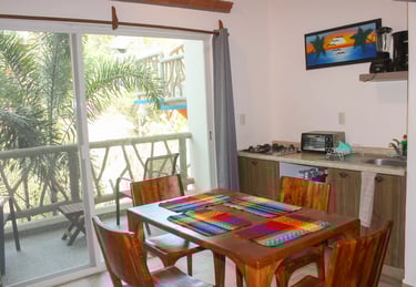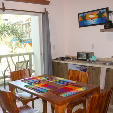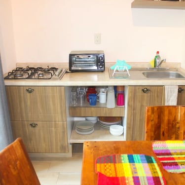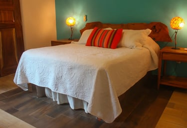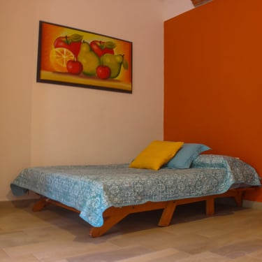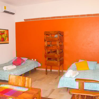 Con 57 m², este amplio refugio en el segundo piso es ideal para parejas, familias o grupos pequeños de hasta 4 personas. Cuenta con una habitación principal con cama queen y baño completo, una sala con dos futones, comedor, cocina equipada para 6 personas y un segundo baño. Su balcón privado recibe la luz del amanecer, y su cercanía a la terraza con alberca lo convierte en una opción versátil y luminosa para disfrutar Sayulita en grupo o en pareja.